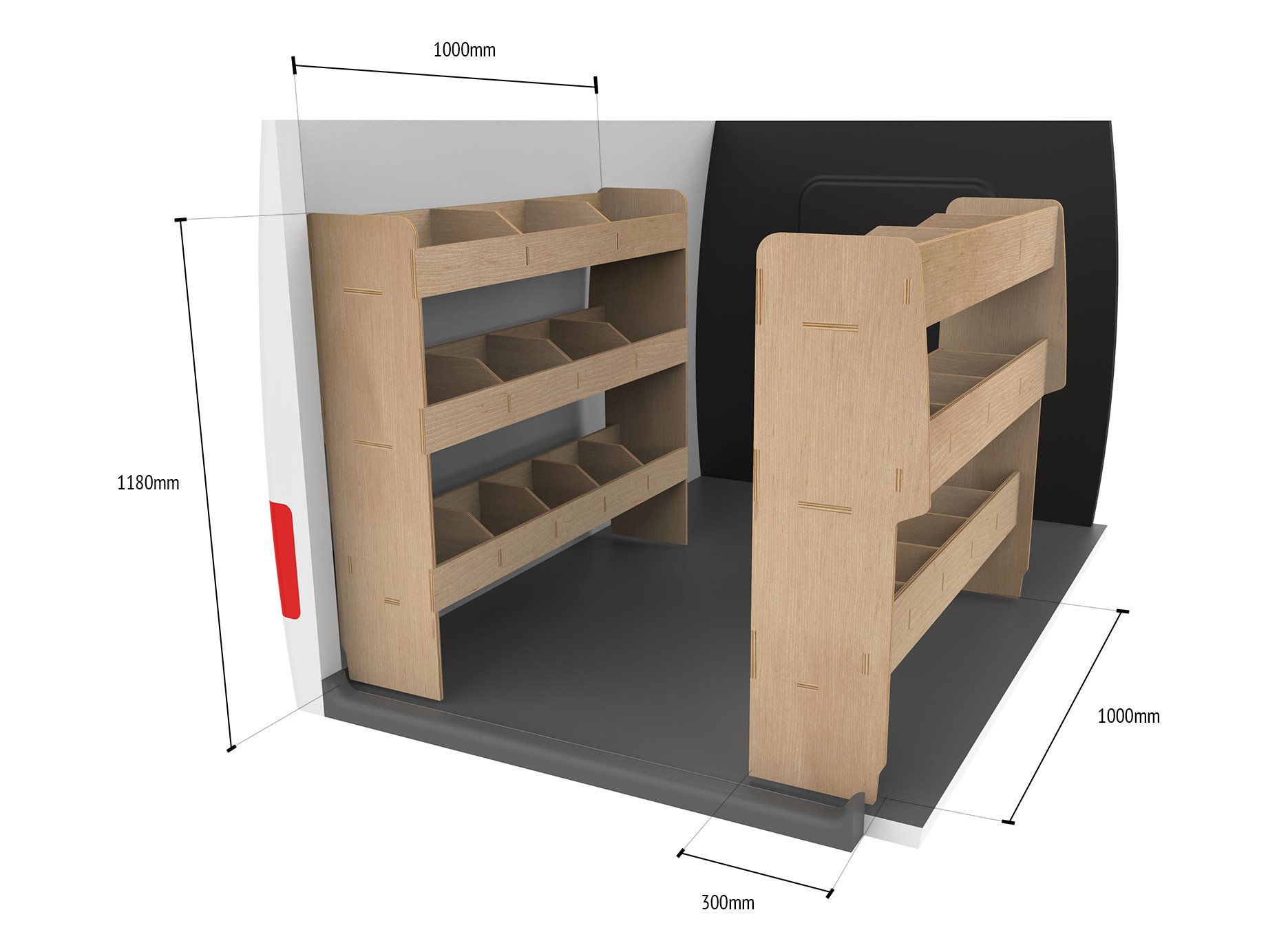 Perfilado específicamente para encajar contra los lados de unTransit Connect 2014-23 L2 furgoneta, estas estanterías aumentan la capacidad de almacenamiento de su furgoneta sin comprometer el espacio.