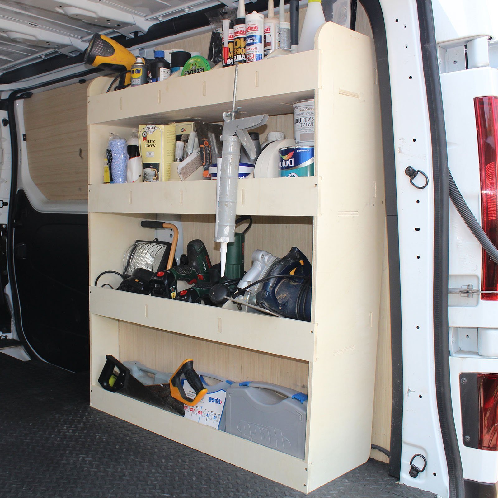 3 estantes con 12 compartimentos de almacenamiento proporciona una enorme cantidad de espacio para almacenar, organizar y acceder fácilmente a todas tus herramientas, equipos y materiales. Nuestras estanterías para furgonetas te permiten encontrar fácilmente lo que necesitas, cuando lo necesitas.