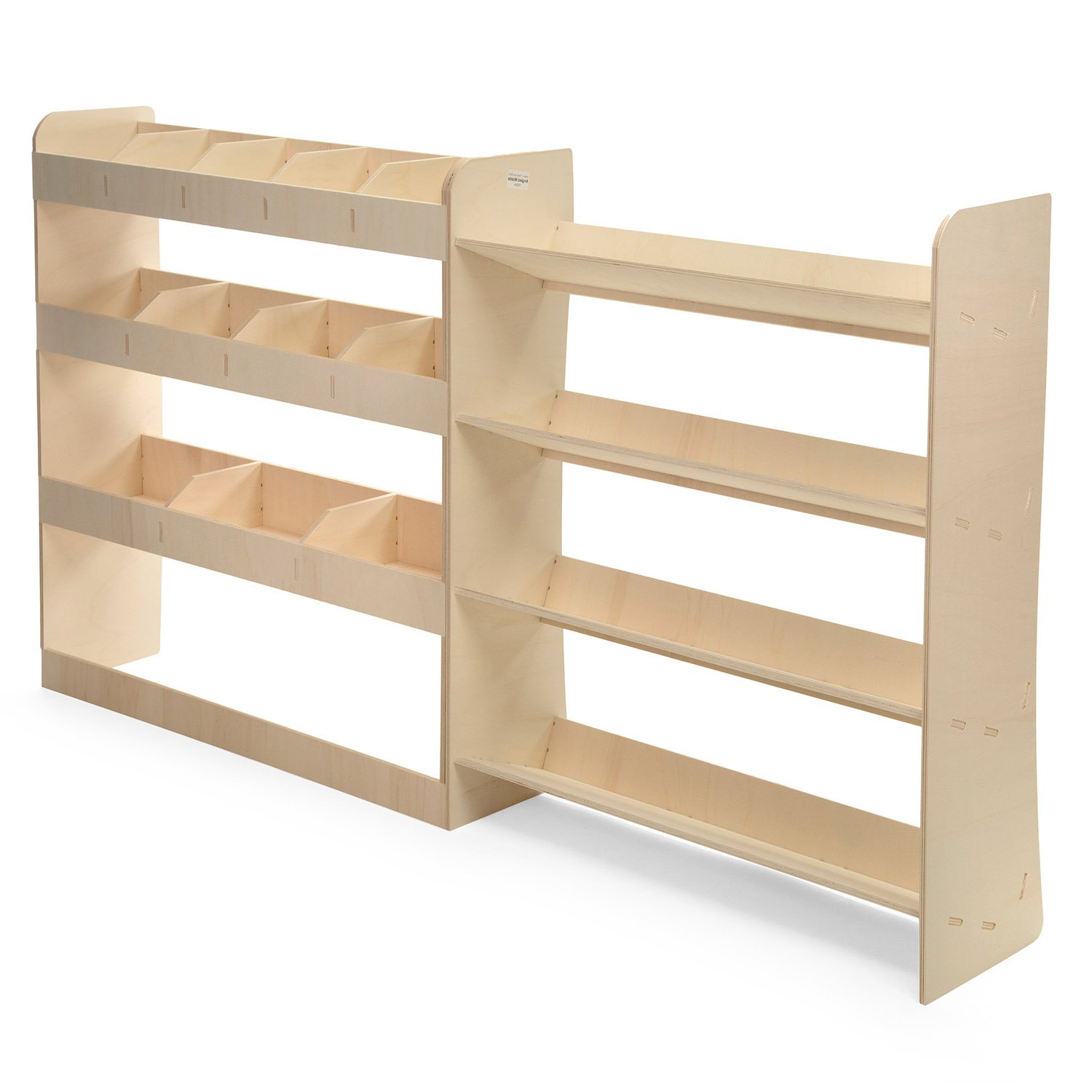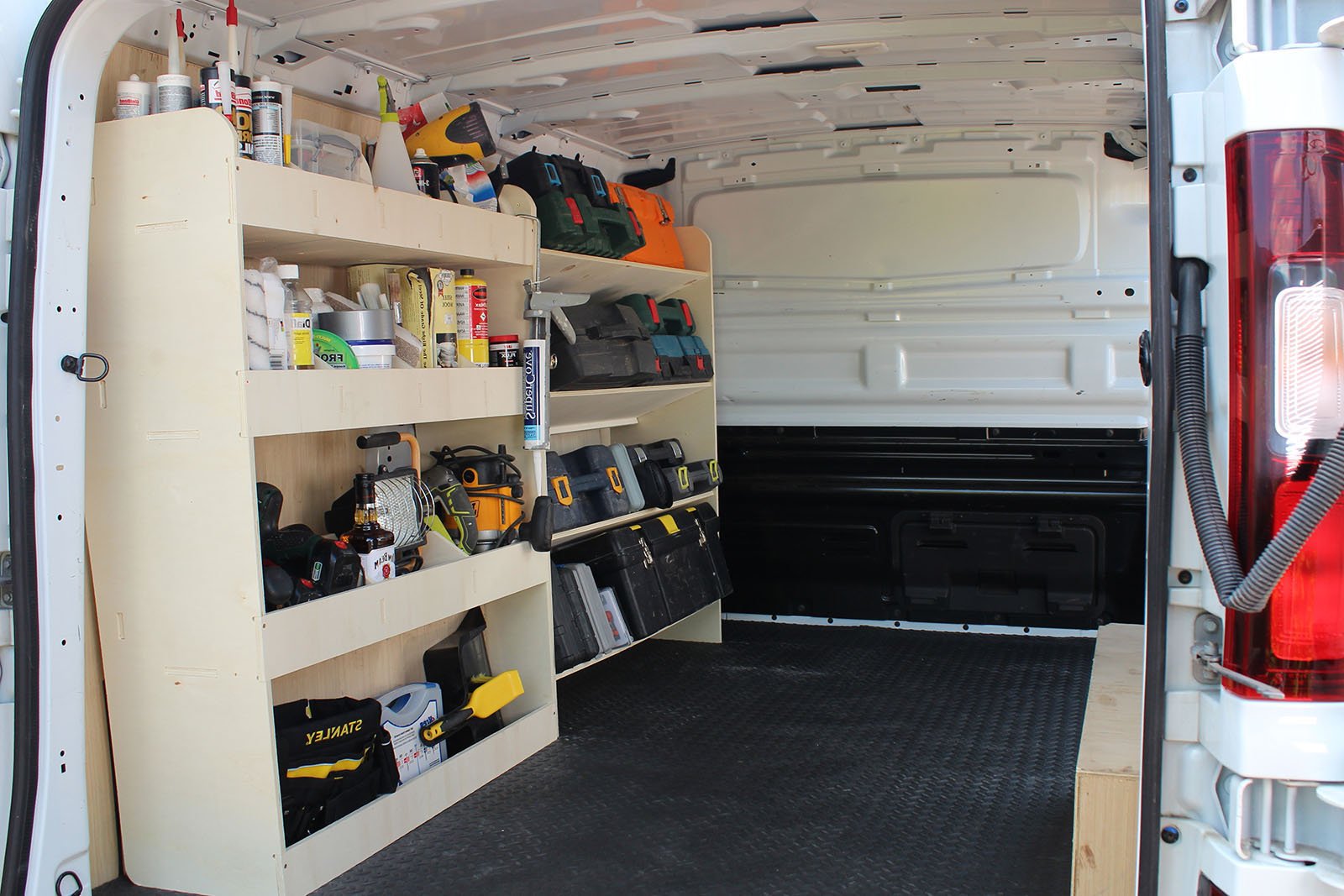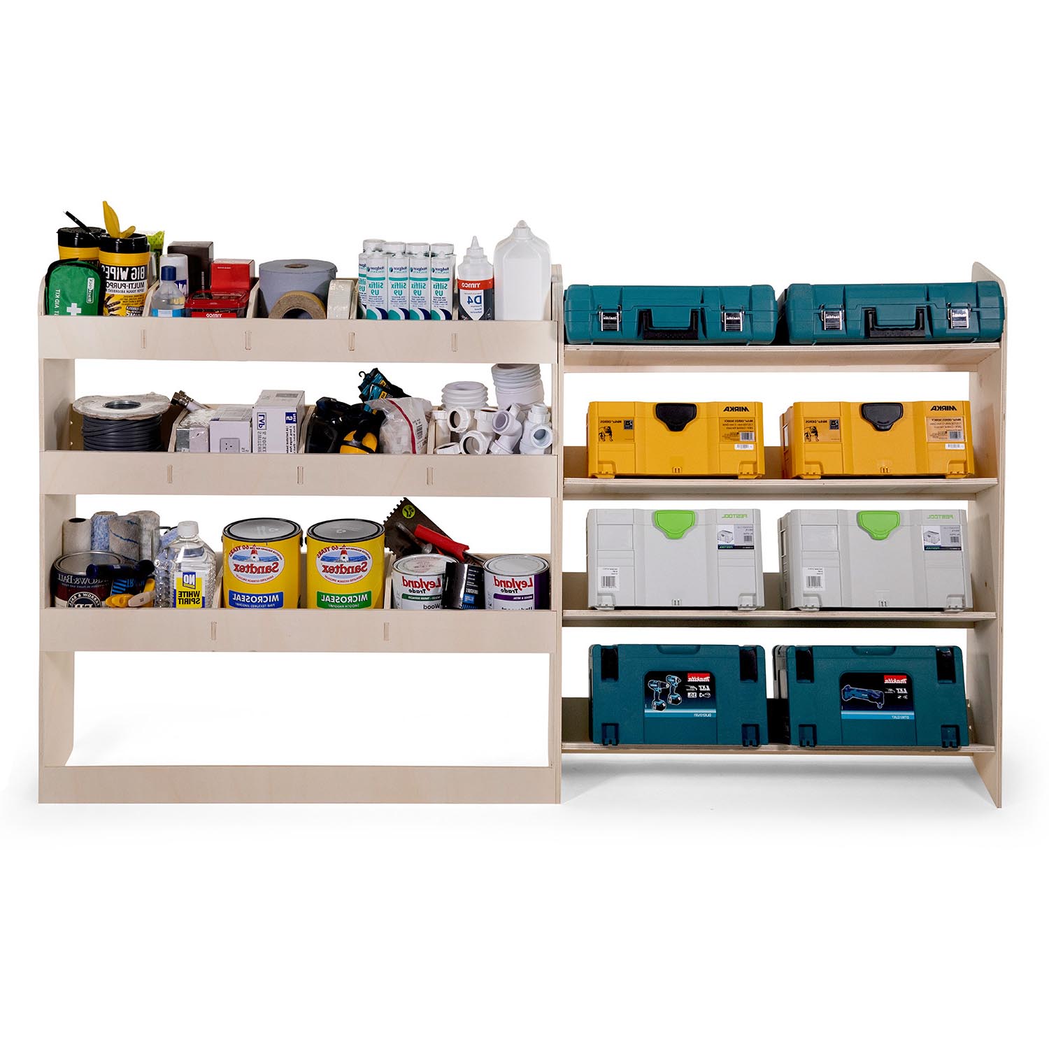 2 estanterías. Una unidad de almacenamiento de herramientas y una estantería con varios compartimentos diseñada para adaptarse a todo el lado del conductor