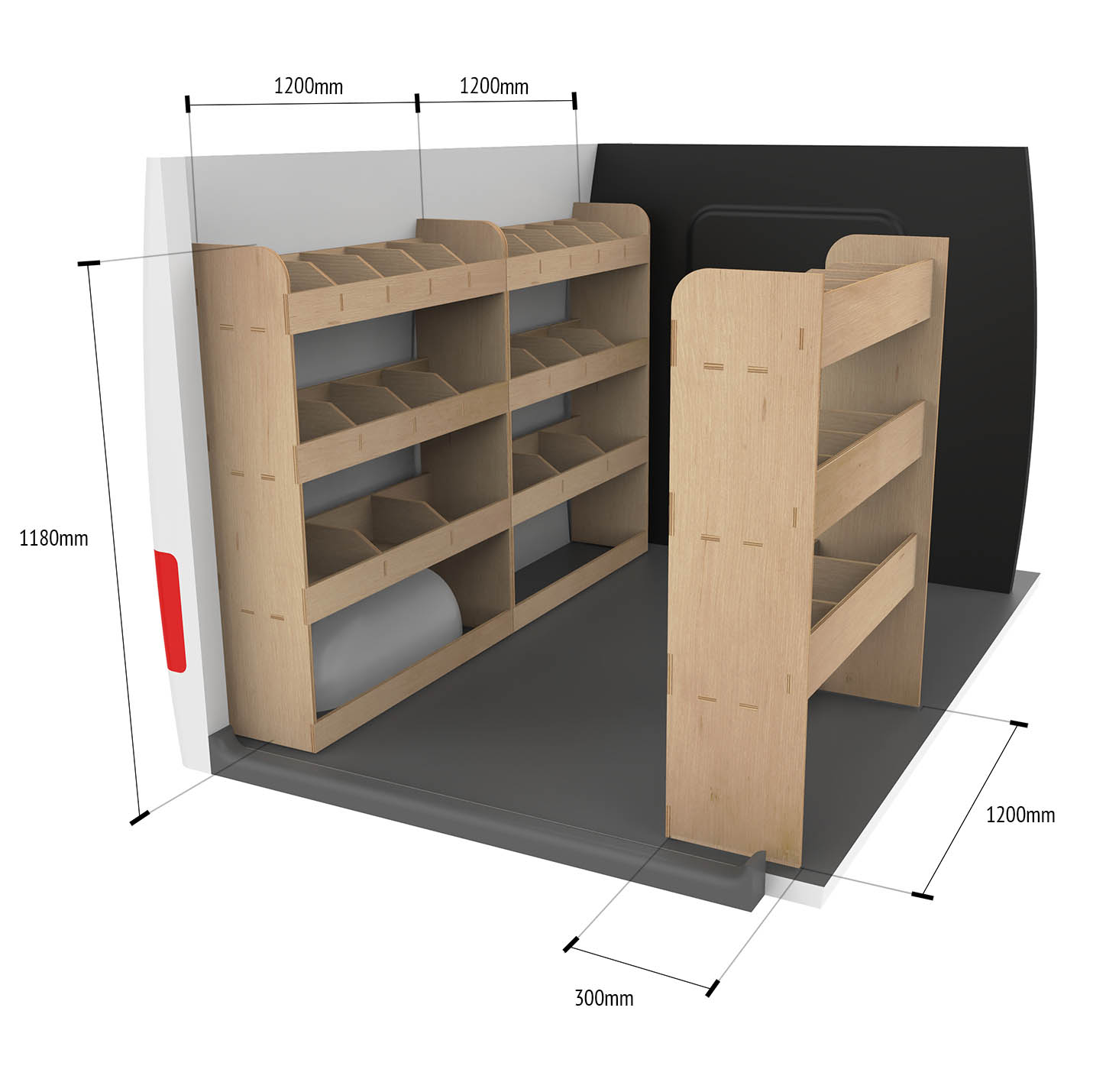 Este sistema de estanterías para Nissan NV300 consisten en 3 estanterías modulares, 2 que se adaptan a todo el lado del conductor y una para el lado del pasajero. Se trata de un sistema completo de estanterías para furgonetas que maximiza la capacidad de almacenamiento de tu furgoneta.
