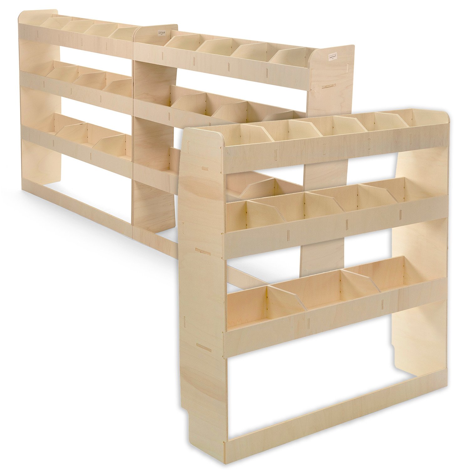 Un total de 9 estantes y 36 compartimentos de almacenamiento proporciona una enorme cantidad de espacio para almacenar, organizar y acceder fácilmente a todas tus herramientas, equipos y materiales. Nuestras estanterías para furgonetas te permiten encontrar fácilmente lo que necesitas, cuando lo necesitas.